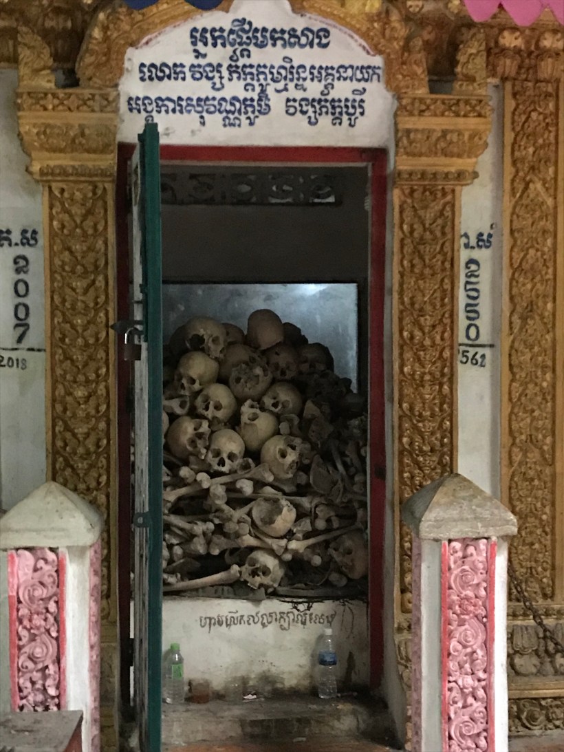 La circolazione non è esente da rischi anzi è davvero pericolosa su una strada disseminata di buche e percorsa da enormi camion che strisciano di fianco al riscio con la grazia di un elefante a pochi cm da uno scarafaggio. Il rischio diviene massimo su quella che sarà l’odissea del ritorno sotto il consueto diluvio del monsone, allorquando , tra le buche e le simpatiche secchiate d’acqua rovesciate dallo sgommare dei succitati camion, ho la sensazione di essere un calzino nella centrifuga di una lavatrice. Il sito visitato si rivela comunque interessante, con una prima grotta detta “dello sterminio” dove i khmer rossi si dilettavano nel loro passatempo preferito: l’uccisione di civili innocenti, scaraventati giù nella cavità da enorme altitudine