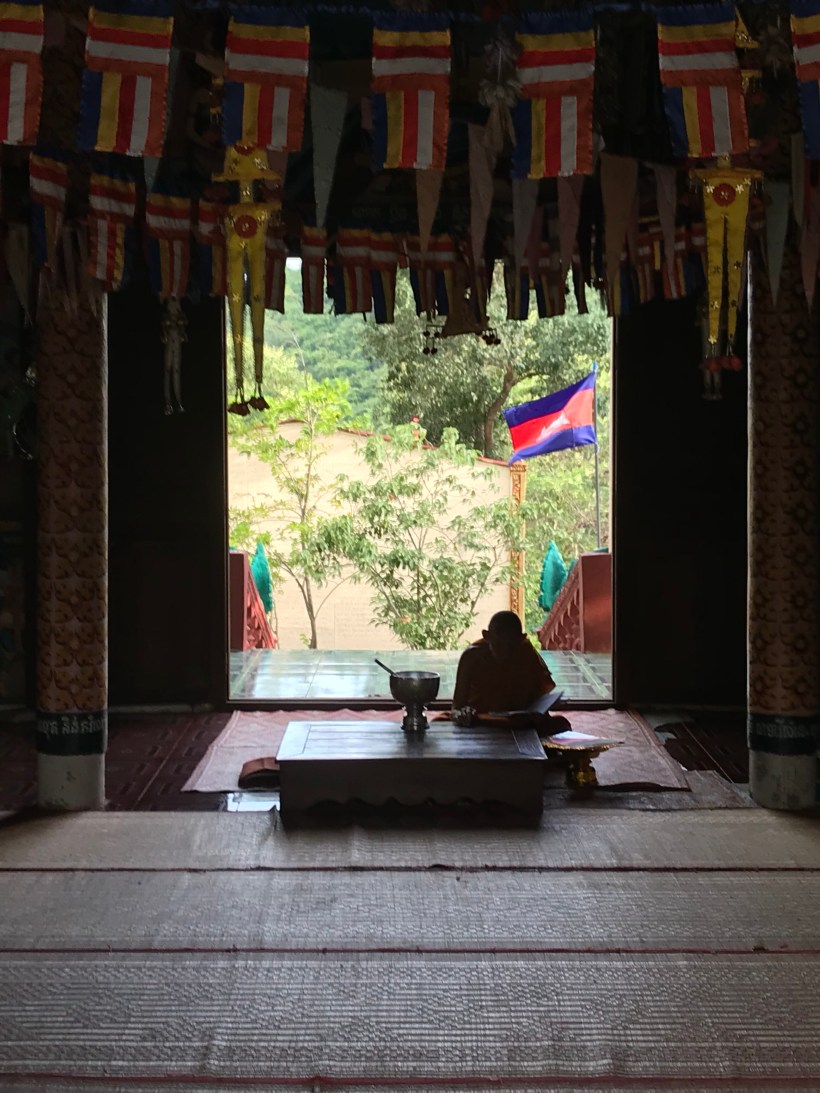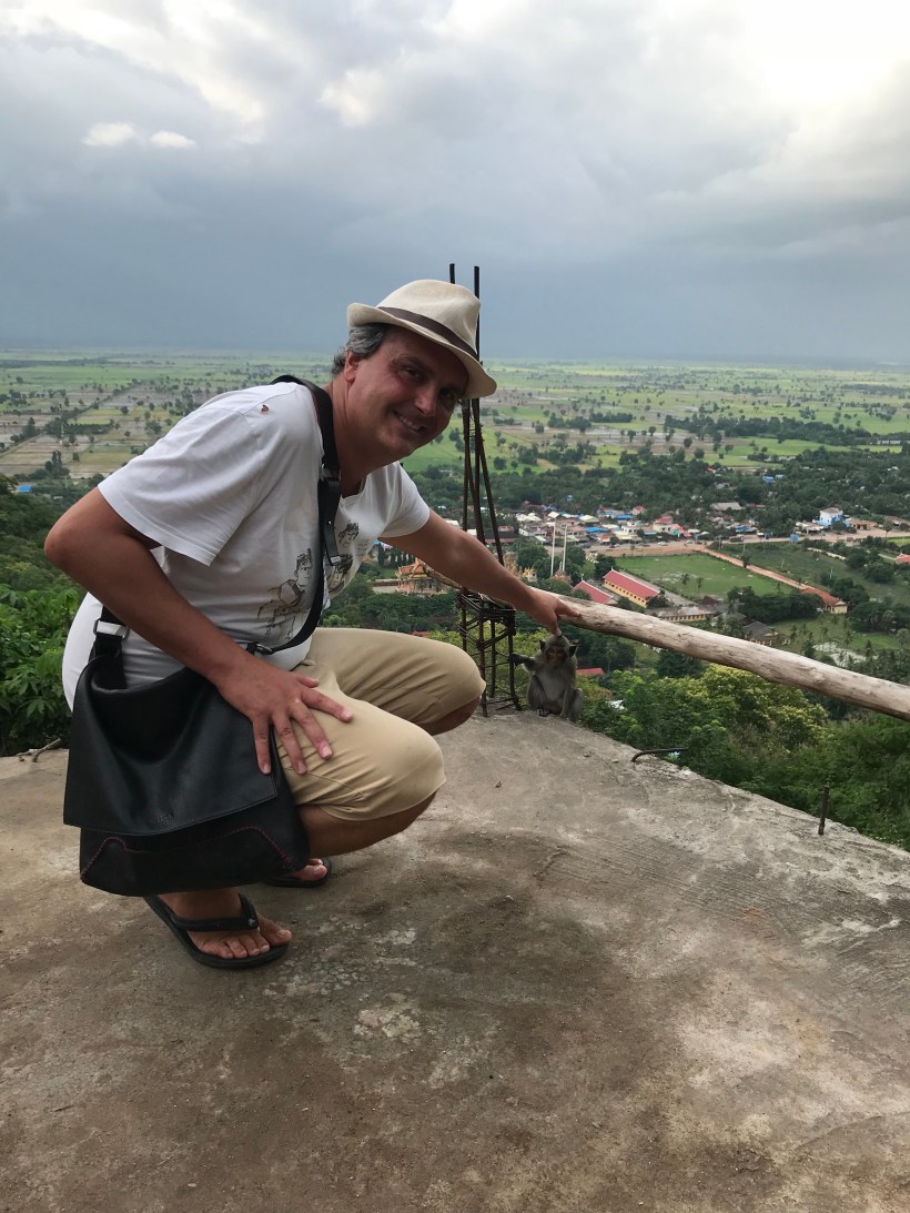 La visita al monte continua a rivelarsi interessante con la visita ad un’altura da cui si intuisce la forma della Cambogia: una sorta di padella orlata di monti lungo i confini e poi piatta e riempita di argilla al centro. Il fondo della padella sovente si riempie d’acqua creando una pappa fangosa in cui nuotano un po’ tutti, persone , templi, coccodrilli e ahimè tanta spazzatura. In cima a questo sperone calcareo sta un bello stupa buddhista risalente all’anno mille, sorvegliato da decine di scimmie piuttosto animose e suscettibili