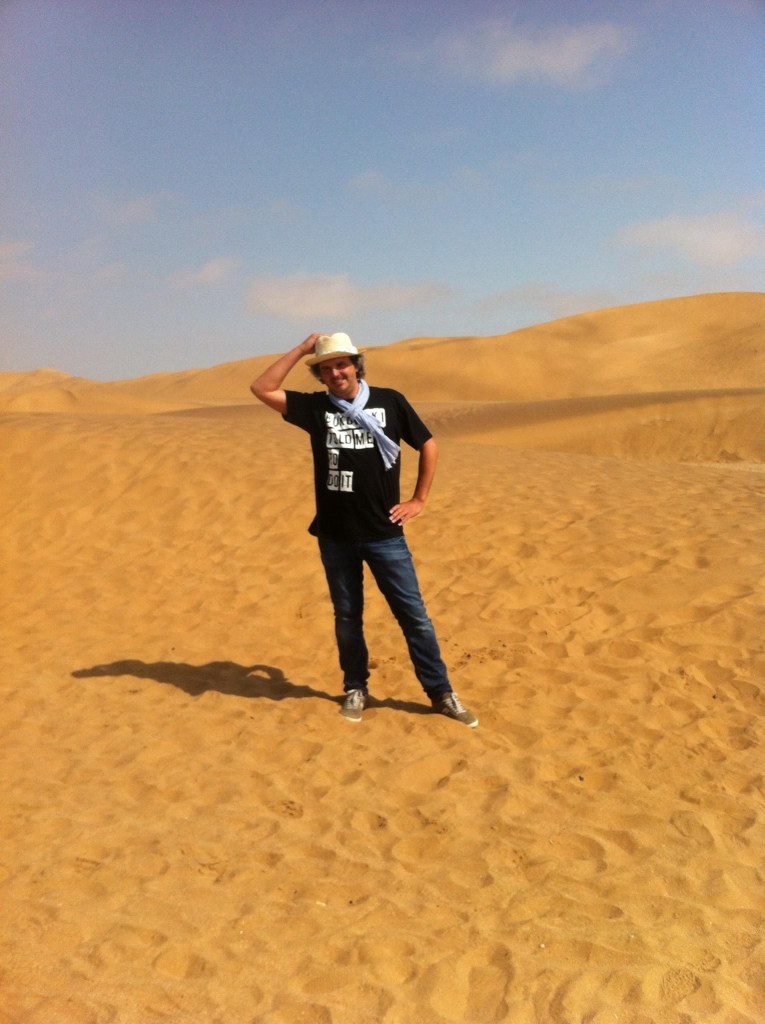 Sono arrivato qui a bordo di un volo di questa Maluti Sky, compagnia della quale dubito che la Emirates o la Swiss ari possano temere la concorrenza ma che un pregio lo tiene: vola bassa quasi radente come un caccia della seconda guerra mondiale, almeno quel trabiccolo che ho preso io. Ne approfitto per gustarmi tutta la vista atlantica andando da Città del Capo verso nord: lentamente il verde di quelle terre lasciano il campo ad un marrone, poi cominciano a distinguersi chiazze di sabbia, in pochi minuti ci troviamo a sorvolare un enorme distesa di sabbia rossa senza soluzione di continuità, ad eccezione di alcune rocce basaltiche nere come il catrame che aumentano la percezione aliena. E’il deserto del Namib, il secondo piu’arido al mondo dopo le Dry Lands del’ Antartide (si proprio così). Anche all’origine di questo deserto c’entra l’Antartide: da li risale la gelida corrente del Benguela, che lambendo queste coste rende impossibile ogni brezza marina; in pratica si innesta un fenomeno termico del tutto opposto a quello che normalmente si sviluppa vicino al mare, qui il mare “succhia” a se tutta la umidità della terra prosciugandola e sfarinandola in questa terra rossa. La costa, avvolta in un nebbia perenne, prende il nome sinistro di Costa degli Scheletri, anche per via delle tante carcasse di nave naufragate in questo luogo dimenticato da dio e dagli uomini. Appena all’interno, anzi praticamente fino a mare, si estende immenso il Namib, un deserto dove non piove mai ne è rinvenibile quasi alcuna forma di vita. Nondimeno allora quando l’esercito tedesco scappo’ da queste terre ostili (se hanno mollato persino i tedeschi….), da un’accampamento militare fuggirono o furono lasciati liberi a morire li qualche centinaio di cavalli…..contro ogni logica le povere bestie sono riuscite a sopravvivere e riprodursi, dando luogo anche ad una sorta di mutazione e divenendo assai più piccoli, e cento anni dopo i Feral Horses del Namib sono tra le poche specie viventi ad abitare qui. A me basta un’ora e mezzo di sorvolo a bassa quota sopra sto mondo deserto per essere sul punto di entrare nella cabina del pilota a chiedergli se per caso non ha sbagliato rotta o voglia cmq tornare indietro (siamo in tre più l’equipaggio a bordo…) e quando lui annuncia che stiamo atterrando non riesco davvero a capire come sia possibile e dove mai poggiarsi. In effetti questo “aeroporto” detto Walvis Bay e’poco altro che una striscia di sabbia battuta vicino una delle dune più alte del mondo, detta Duna 7 (nei pressi della quale è scattata la foto), stanno poi un paio di capannoni ove la grande attrattiva e’ uno strano macchinario a raggi infrarossi che farebbe uno screening per vedere se hai contratto l’Ebola. Risulto verde al controllo ed eccomi fuori nel bel mezzo del nulla. Nel parcheggio ci sono 5 automobili di numero, una delle quali condotta da un donnone di nome Deli mi scaraventa nel deserto per una trentina di km, fino alla capitale della Costa degli Scheletri, tale cittadina detta Swakompund, dal fiume effimero Swakom che ha dato segni di esistenza l’ultima volta nel 2010. Le sorprese sono appena iniziate: la città e solo essa è avvolta da una fitta nebbia grigia, entro la quale si muovono individui di pura razza ariana germanica. Tutto è’ tedesco qui, le case in architettura bavarese manco fosse Salisburgo e le strade intitolate a Bismarck e Leopoldo di Baviera, gli abitanti biondissimi in gilet verde orlato di merletti che parlano il tedesco dei tempi di Goethe e sembrano vagamente informati di alcune “degenerazioni” della società moderna quali l’abolizione della schiavitù e il suffragio universale. Sono sicuro che si sarà nascosto qui a Swakompund anche più di un criminale nazista, magari con propositi di filiazione della razza ariana. Appena fuori dalla città ariana e dalla sua perenne nebbia, un deserto assolato per migliaia di km di dune rosse. La notte cala veloce a Swakompund e una ottima cena a base di pesce in un ex rimorchiatore gestito da un ex pugile africano detto Hitman non basta a togliermi di dosso la sensazione che i tedeschi rincasati presto, dietro le loro tendine orlate di merletti, abbiano pezzi di africani dentro i frigoriferi.
