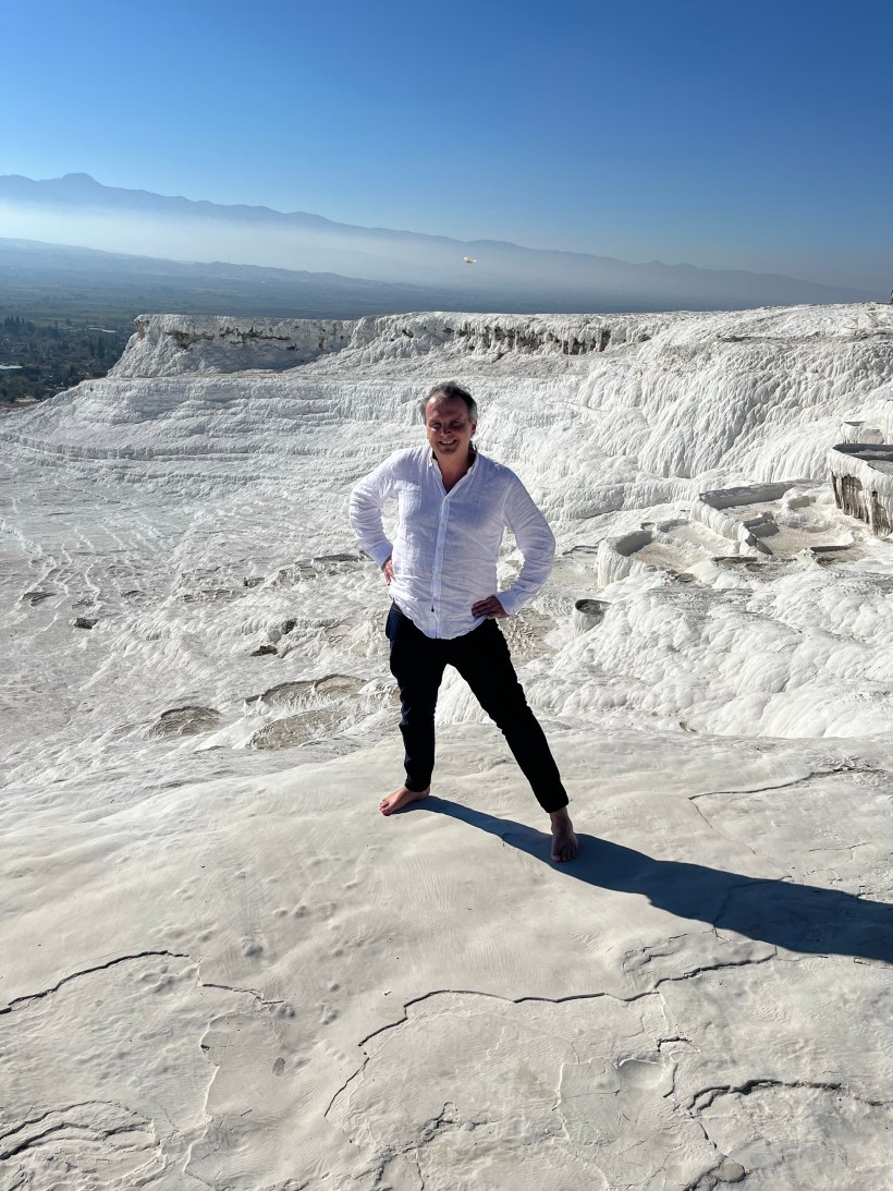 Arriviamo ordunque dopo circa 4 ore a questa Denizli, che pare una città sudamericana di quelle inerpicate sulle Ande ad alture impensabili. Qui la quota da raggiungere è quella dove il fiume Menderes disegna nel marmo travertino bianco della roccia una serie di bizzarrie geologiche che paiono le bizzarrie di un architetto barocco ubriaco o forse anche le lande di un mondo alieno . Per di più nei pressi sorgono le bellissime rovine di una città prima greca e poi romana , Hierapolis. È giustappunto sto mio essere così saputello, sapere tutte ste cose su ste rovine di Hierapolis che qui non si caga nessuno, che stavolta mi tende un brutto tiro. Si, perché sul dolmus (i pulmini collettivi che partono quando sono pieni) comincio a dire al l’autista di Hierapolis e se il bus ferma da quelle parti . Quello, tutto fiero che finalmente arriva qualcuno che chiede di Hierapolis, fa la brillante pensata di farmi scendere non con tutti gli altri, che vanno a vedere il banale “Castello di cotone” dall’ingresso a valle, ma scapicolla solo me e il suo pulmino sgangherato fin sulla cima di una montagna , dicendomi di fidarmi e che da da li avrei attraversato la magnifica Hierapolis culminando poi sulle vasche di travertino bianco di Pamukkale . Tutto molto bello ma non se hai i minuti contati e uno zaino di una decina di chili sulle spalle . Si , perché quello resta con me, dovendo per forza di cose entrare dal lato a monte ed uscire da quello a valle 4 km più giù; inoltre i simpaticoni all’ingresso, dagli addetti alla biglietteria a quella del bar , con un rigore più tedesco che turco, dicono che non possono giammai assumersi il rischio di detenere un bagaglio sconosciuto manco per un’ora . E jammuncenn: con sto fardello sulle spalle mi scendo tutta Hierapolis, bella bellissima su un alto pianoro riarso dal sole che proporrà immagino temperature infernali nei mesi estivi . Le vestigia di un tempio romano si stagliano maestoso contro il cielo turchese . Poi in un nitore bianco accecante appaiono le vasche di marmo ricolme di un’acqua anche essa turchese. Le falesie marmoree ridondano poi di un sedimento di carbonato depositato dal fiume, che pare come un pulviscolo, come appunto ciuffi di cotone pronti a prendere il volo. Sembrano come balze di un purgatorio in cui immergersi in catarsi . E sotto la pianura anatolica corrugata da montagna e sconfinata verso l’orizzonte e oltre , che dovrò percorrere per migliaia di km ancora , a partire da questa stessa notte dove un altro treno mi porterà molto lontano . Andiamo !