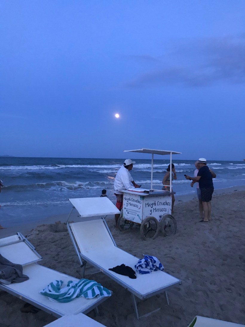 Oltre a noi la spiaggia accoglie il via vai dei venditori locali che, a differenza della solita paccottiglia propongono qui leccornie come aragoste appena pescate, ostriche del luogo, calamari, polpi, tutto di una freschezza inimmaginabile ormai alle nostre latitudini. Paradossalmente la profonda crisi in cui il Venezuela è sprofondato ha, almeno da questo punto di vista, migliorato la qualità dell’offerta: la grande distribuzione dei supermercati è ferma da tempo e ormai inesistente, i locali sono costretti a fare tutto da se e il risultato, almeno sul cibo, è eccellente.