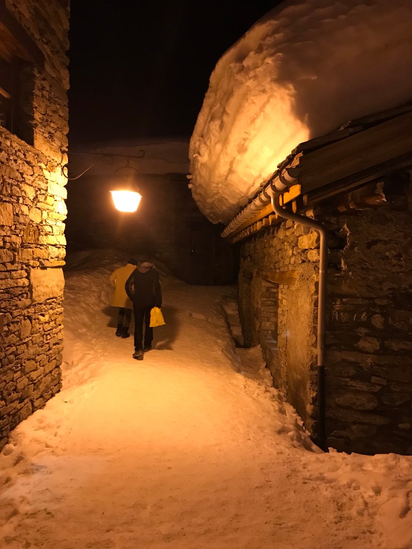 E si arriva a Bonneval, un magico borgo in pietra in fondo ad una valle chiusa, con i tetti talmente ricolmi di neve da chiedersi come possano non cadere e le croci della chiesa che a malapena emergono dal mare bianco. Qui domattina sarò testimone di un bellissimo matrimonio, come in un romanzo di Stendhal o di Flaubert