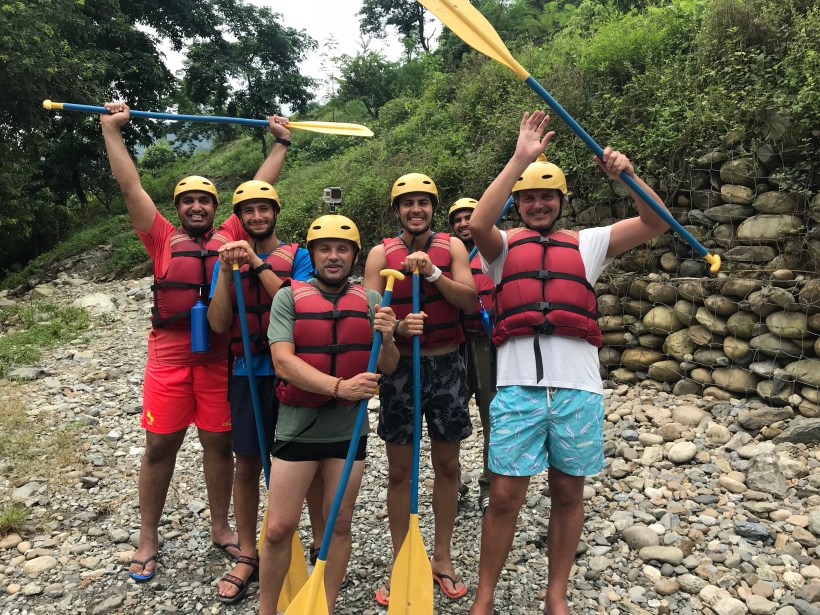 c’è un timoniere locale cicciotello sui diciotto anni, io e due ragazzi spagnoli, e fin qui nulla di troppo strano; poi arriva un ragazzo israeliano e due che sembrano Stanlio e Olio…..dell’Arabia Saudita. Israeliani e arabi intrattengono notoriamente relazioni tutt’altro che amichevoli anzi si odiano reciprocamente e ora devono scendere un fiume in piena in una gola dell’Himalaya.
