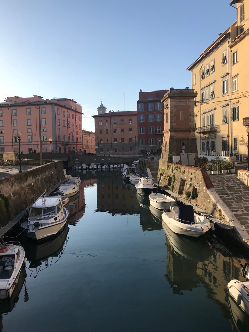 Son giunto qui altresì per perdermi nel centro storico di questa città, che sorge sui canali come Venezia ed infatti ne mutua il nome, nel senso che appunto il borgo antico di Livorno, il suo insediamento medievale viene chiamato “La Venezia”. È la seconda volta in meno di un mese che mi ritrovo in luoghi che rievocano o perlomeno vengono paragonati alla Serenissima: a marzo nelle Alpi francesi dell’Alta Savoia visitai la bellissima Annecy, e se quella era detta “la Venezia delle Alpi”, Livorno allora potrebbe essere “la Venezia dei poveri”, senza che la definizione assuma una connotazione negativa, anzi. Qui non regnano certo lo splendore e la magnificenza di Rialto o del Canal Grande, anzi è un incrociarsi di canali melmosi dal nome più crudo di “fossi”solcati da piccoli barchini da diporto, ma è un luogo assai più autentico e pulsante della algida ed asettica Venezia, a cui non è stato risparmiato certo il destino toccato a tutti i centri storici di città così belle: quello di diventare dei luoghi del tutto svuotati da quella che era la funzione originaria, abitati solo da facoltosi turisti che non vi vivono stanzialmente e soprattutto non vi lavorano, deprivando i luoghi di quella che era la sua funzione originaria, la sua ossatura. Nei centri storici di Roma, Firenze , Parigi trovi piazze del mercato dove non esiste nessun mercato, vie che rimandano a professioni che nessuno si sognerebbe di svolgere: dei “non-luoghi”, come li ha definiti Marc Auge. Qui a Livorno invece tutto “puzza” di vivo