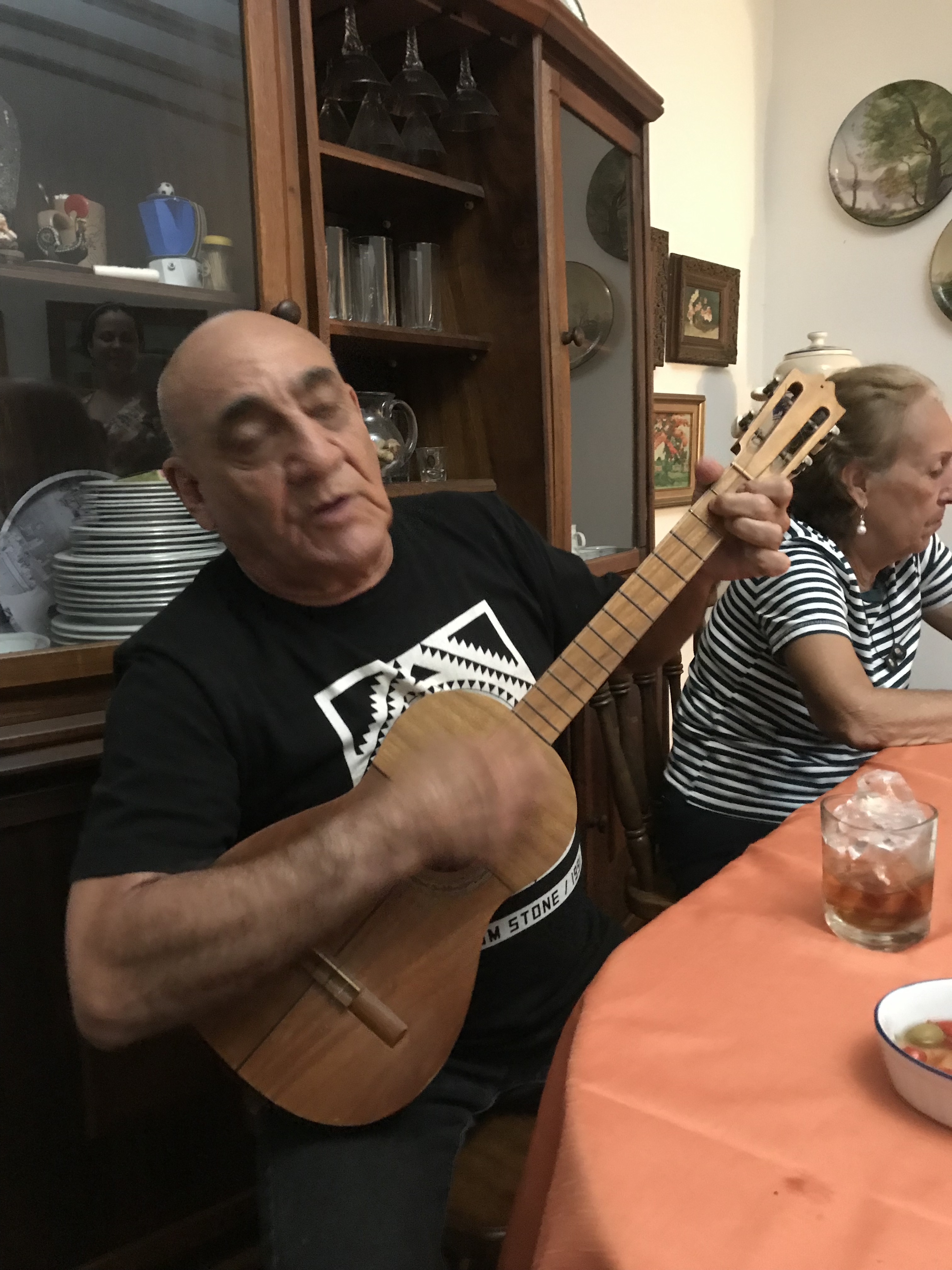 E vi è di più: sono tutti figli di una incredibile signora che troneggia a centro sala e che conta la bellezza di 105 primavere, cento-cinque!!!! È lucidissima ed in grado di ricordare episodi vissuti di infanzia con quelli che, mi pare di capire debbano essere stati i figli dei figli di secondo letto del padre di Leopardi. Il capofamiglia Silvio, detto Silvio Stone per la sua passionaccia giovanile per la formazione di Mick Jagger, intona pezzi napoletani con questa chitarra locale, detta il Cuatro, mentre le gentilissime sorelle mi servono un dolce di origine napoletana, appreso e tramandato tanti anni orsono da avi italiani appassionatissimi di Napoli e la sua gastronomia. …..Mi pare di sapere che Giacomino sia vissuto e amasse assai Napoli, come no! Loro preparano questo dolce ma non ne ricordano più il nome , avendolo appreso dalla madre . La povera senora Leopardi ultracentenaria, sola depositaria della antica ricetta di avi italiani, lo ha ora dimenticato. Li aiuto a risolvere così l’arcano, mi ci vuole molto poco