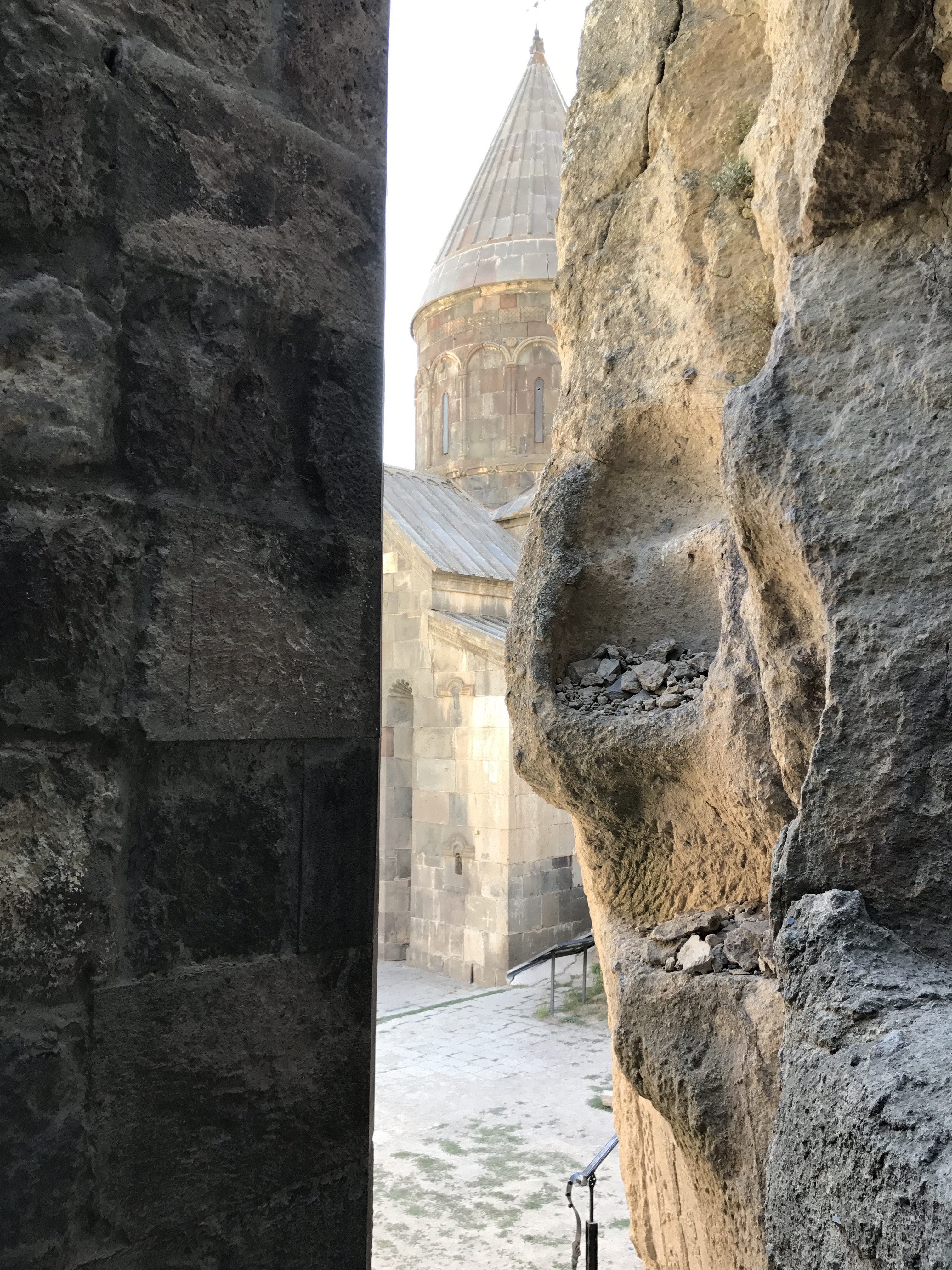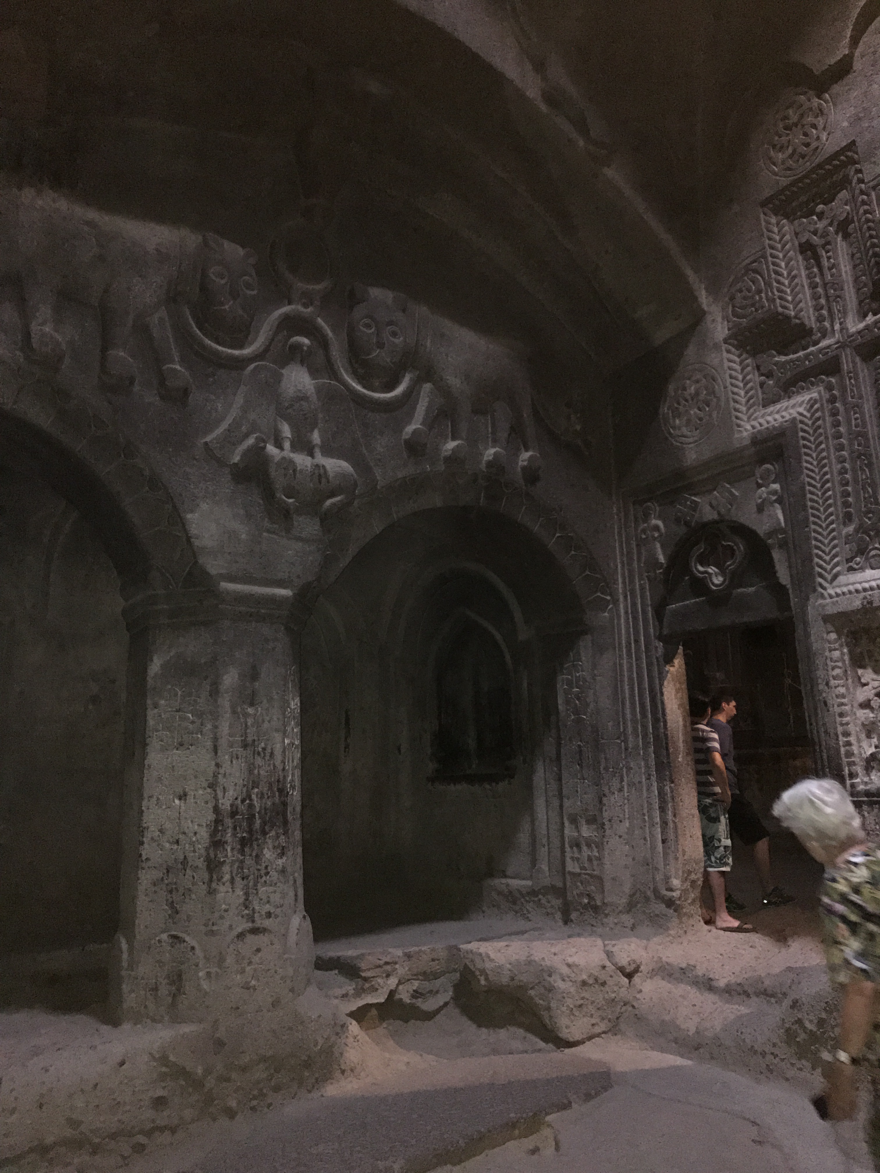È una premessa necessaria non perché sia particolarmente interessato all’argomento religioso ma perché, nel caso di specie appare imprescindibile per una comprensione di questo bellissimo e insanguinato paese. Eccomi ad esempio nel monastero di Geghard, uno dei simboli culturali del paese, così chiamato perché si ritiene che ivi sia stata portata da San Bartolomeo la lancia che trafisse Cristo (la religione armena di differenzia leggermente da quella Cristiana di Roma proprio per un particolare risalto dato alla figura di San Bartolomeo, che non saprei meglio approfondire, quindi evito di dire fregnacce. Il monastero, sito Unesco, è di una bellezza sovrannaturale, quasi come scolpito nella montagna