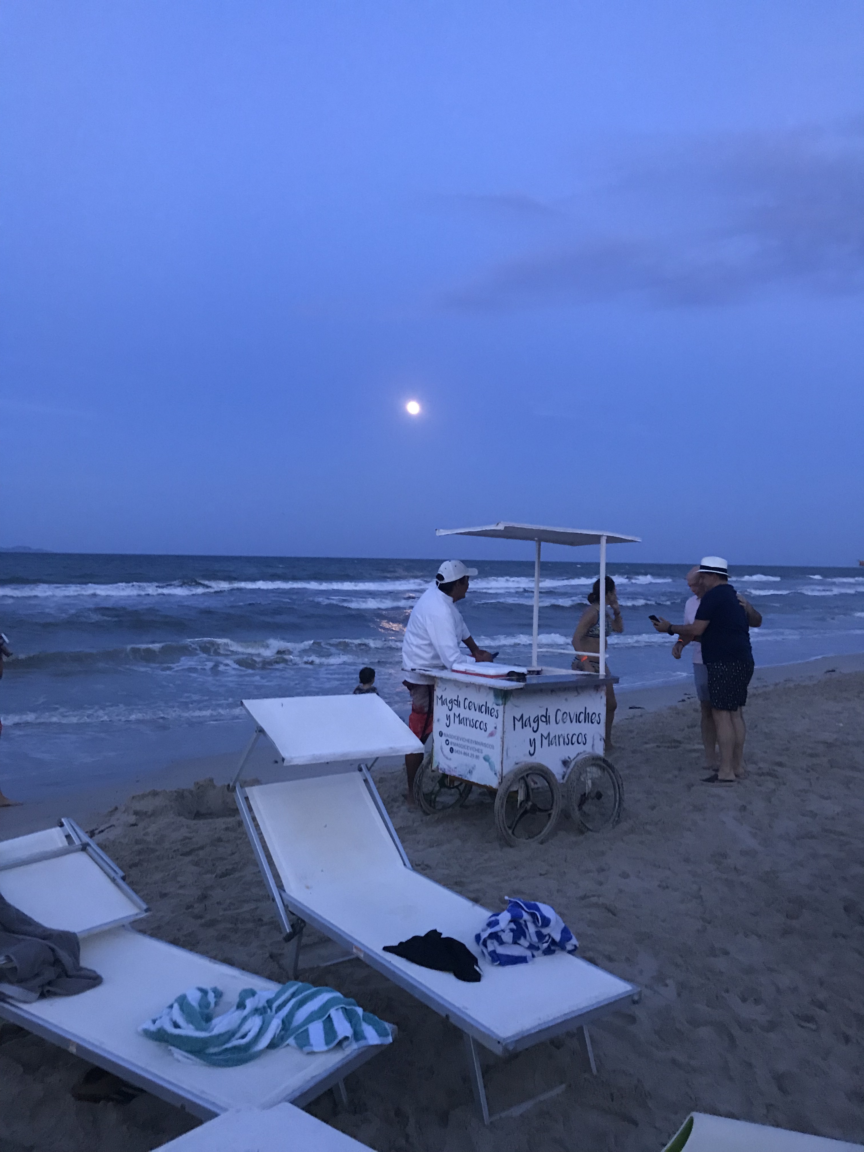 Oltre a noi la spiaggia accoglie il via vai dei venditori locali che, a differenza della solita paccottiglia propongono qui leccornie come aragoste appena pescate, ostriche del luogo, calamari, polpi, tutto di una freschezza inimmaginabile ormai alle nostre latitudini. Paradossalmente la profonda crisi in cui il Venezuela è sprofondato ha, almeno da questo punto di vista, migliorato la qualità dell’offerta: la grande distribuzione dei supermercati è ferma da tempo e ormai inesistente, i locali sono costretti a fare tutto da se e il risultato, almeno sul cibo, è eccellente.