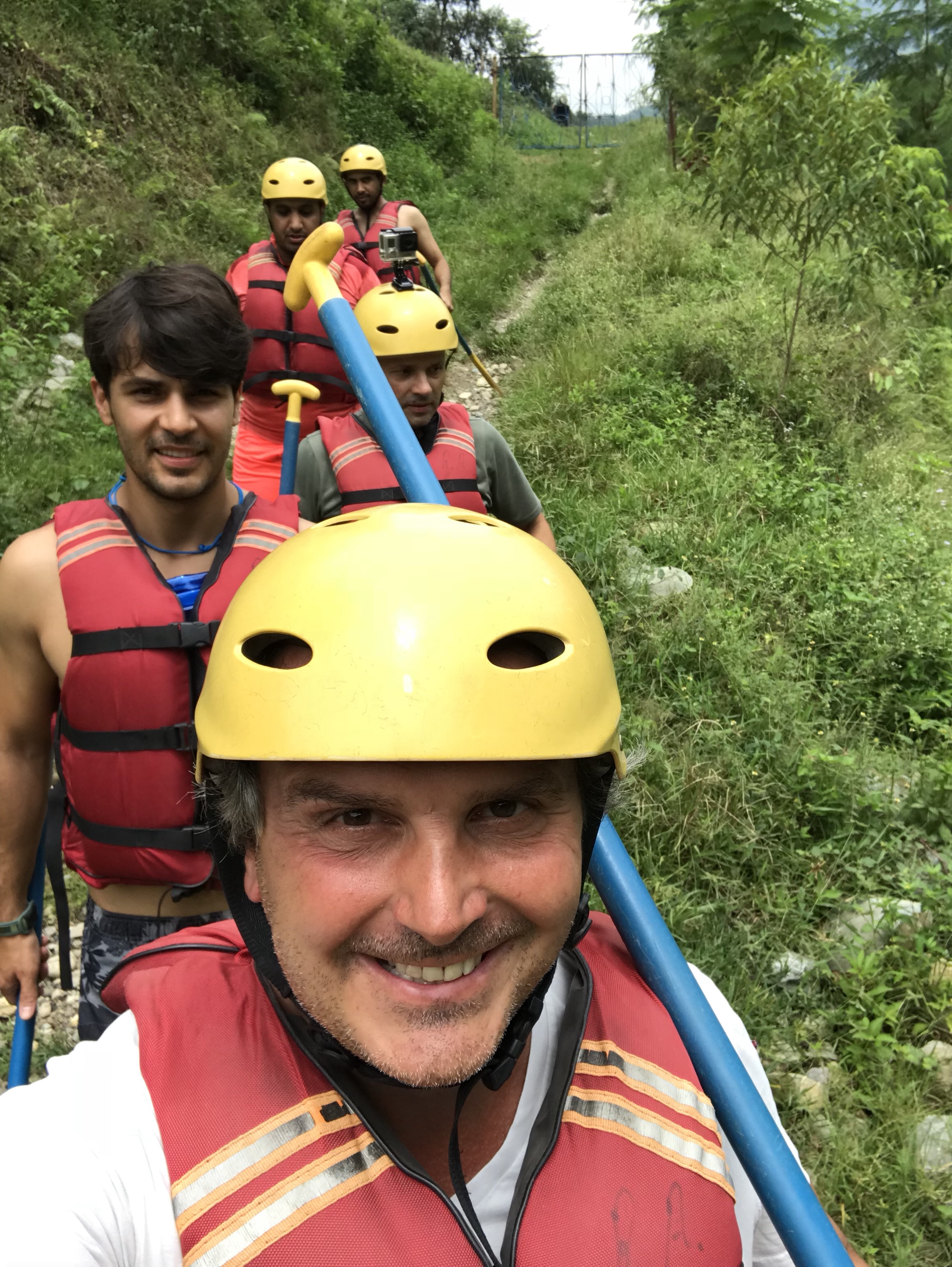 c’è un timoniere locale cicciotello sui diciotto anni, io e due ragazzi spagnoli, e fin qui nulla di troppo strano; poi arriva un ragazzo israeliano e due che sembrano Stanlio e Olio…..dell’Arabia Saudita. Israeliani e arabi intrattengono notoriamente relazioni tutt’altro che amichevoli anzi si odiano reciprocamente e ora devono scendere un fiume in piena in una gola dell’Himalaya.