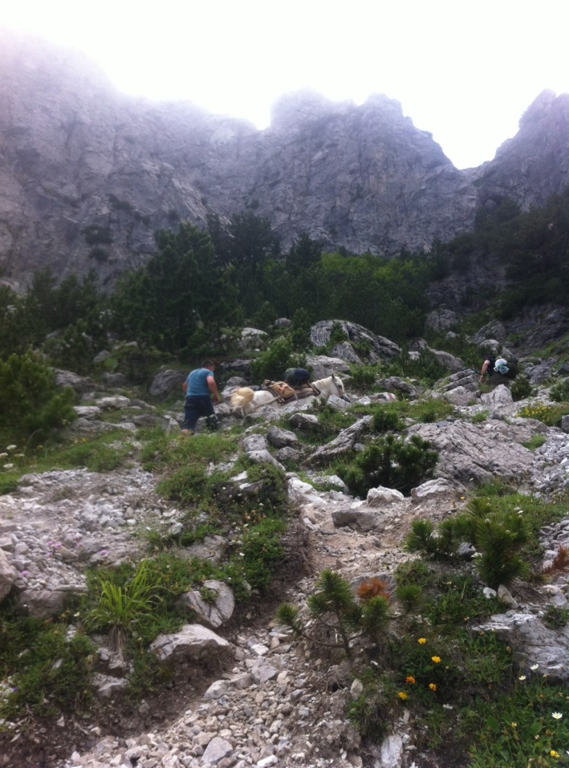Qui raccatto invece gran parte dei maschioni della sera prima, quelli che dicevano di potercela fare senza il cavallo e con lo zainone sulle spalle: ora a gruppi di 3-4 giacciono rovesciati a pancia in su sugli zaini come vaccarelle di San Giovanni, in primis il turco che faceva più di tutti il gallo sulla munnezza e ora pare aspettare solo un defebbrillatore o una morte dignitosa. Più in alto ribecco il mio amico danese che ha passato qui la notte su un amaca per sfuggire alla tedesca che lo cerca coi cani a fondovalle, in compagnia di un esperto personaggio locale che mi fornirà una serie di consigli molto utili sul cavallo e ci saprà indicare un roveto pieno di squisite fragole di bosco