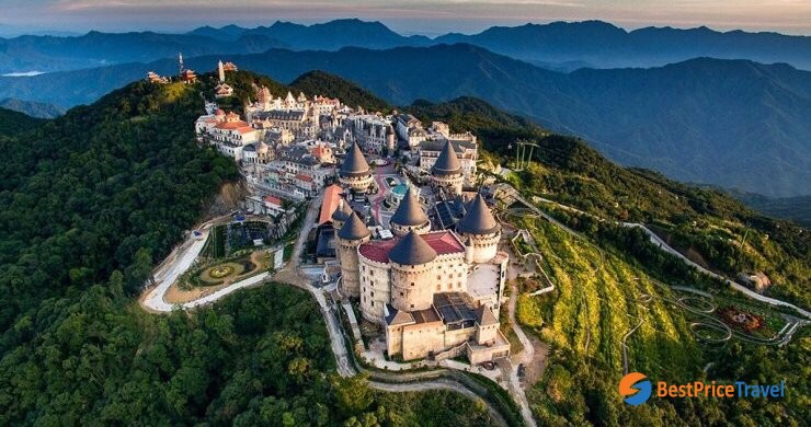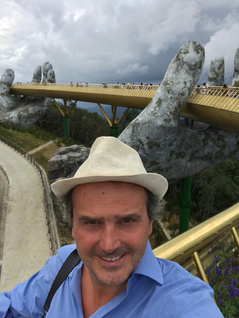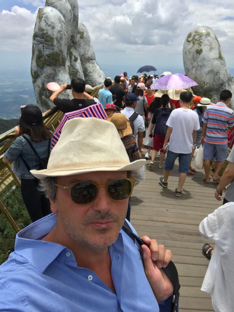 due gigantesche mani di pietra levigata sembrano sospenderlo sull’abisso mentre una passerella sospesa nel vuoto è battuta da migliaia di persone per lo più vietnamiti venuti a contemplare l’ultimo disegno di una smisurata voglia di grandeur