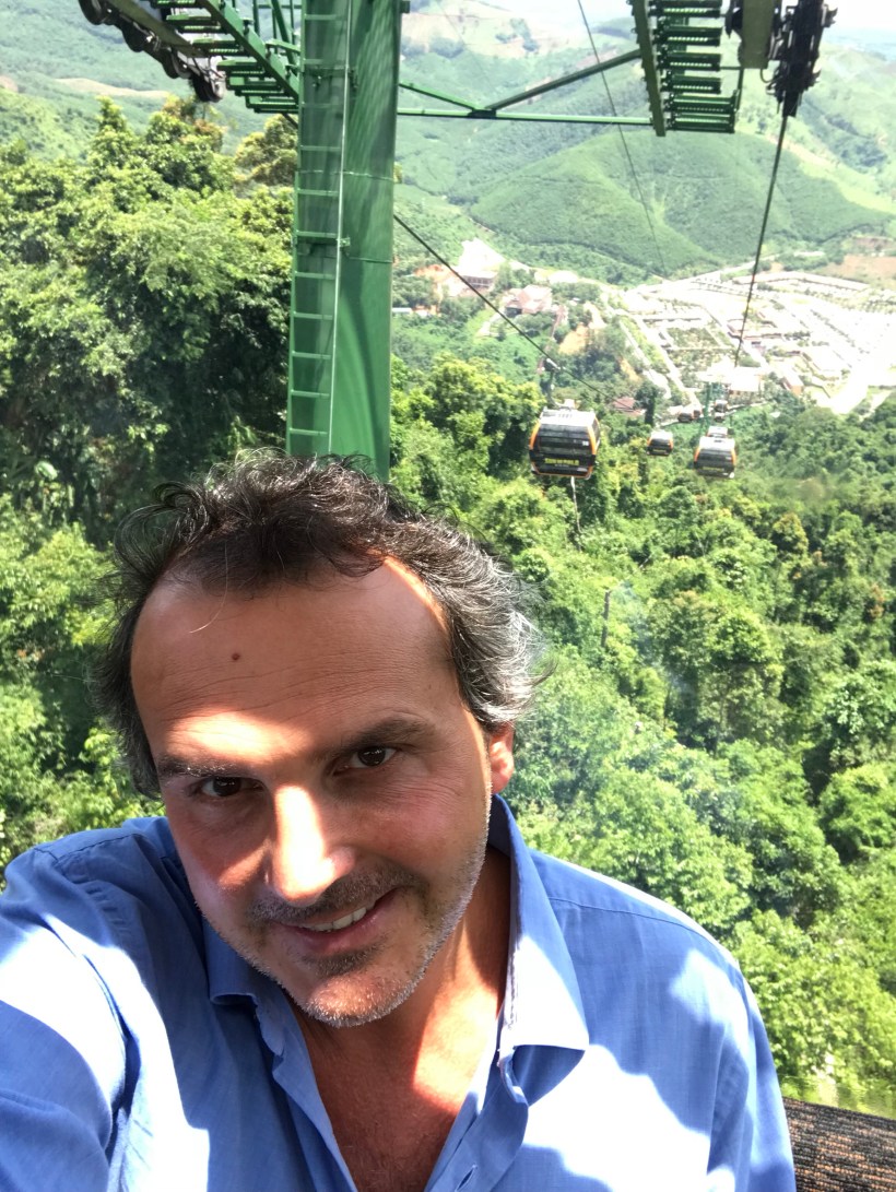 da queste parti, nella regione collinare di Ba Na, sorge una vecchia “Hill station” edificata negli anni ’20 dai francesi per scappare dal caldo asfissiante della pianura. Sul sito ormai abbandonato pare che i vietnamiti abbiano edificato uno spettacolare ponte sospeso di recentissima inaugurazione, luglio 2018 addirittura, di cui parla tutto il mondo ….Mantengo un mio scetticismo perché dalle foto mi pareva una mezza tamarrata ma intanto mi avvio, chiedendo al mitico easy rider Mr Thai di dare una acceleratina al gas. Giunti a piedi delle colline, mi congedo da lui e mi precipito a prendere questa mastodontica funivia con cui scalare i duemila metri di dislivello e raggiungere il ponte